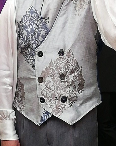 Un gilet hommes aux torsades argentées et au tissu de coton pur.