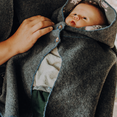 Cape laine bouillie bleu acier, capuche doublée coton fleuri, fentes main finition biais coton...