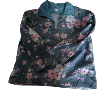 Vareuse coton fleuri, col doublé coton uni, fente devant, manches droites.