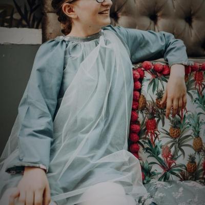 Robe à encolure plissée, manches raglan, tulle blanc et coton bleu lavande, finitions...90,00€ TTC