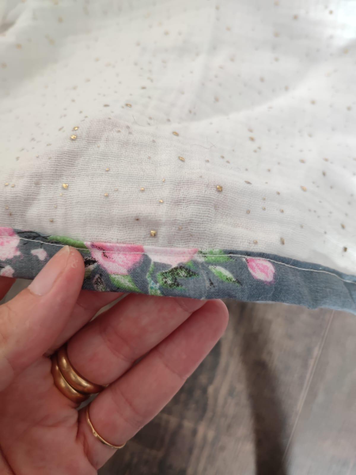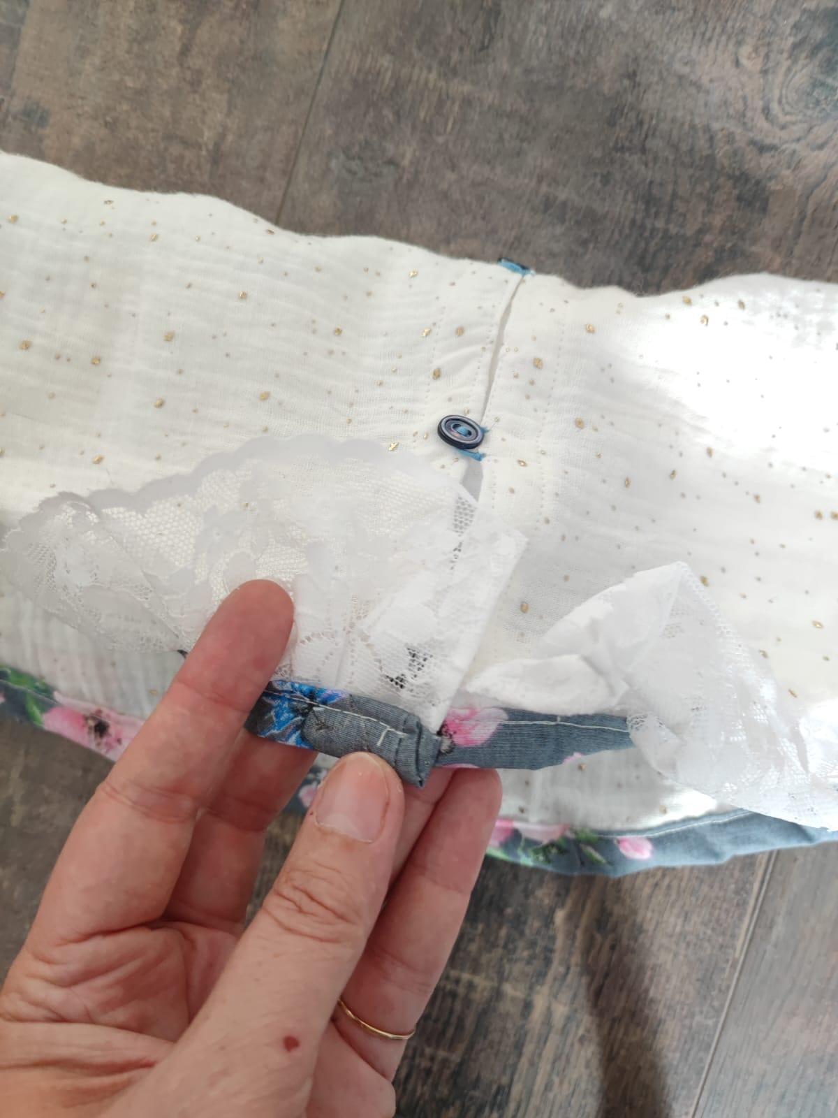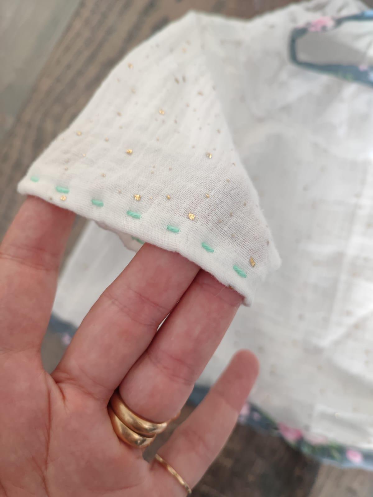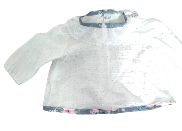 Brassière double gaze blanche avec inclusions dorées, finitions biais coton fleuri, col plissé dentelle, boutonnage arrière.