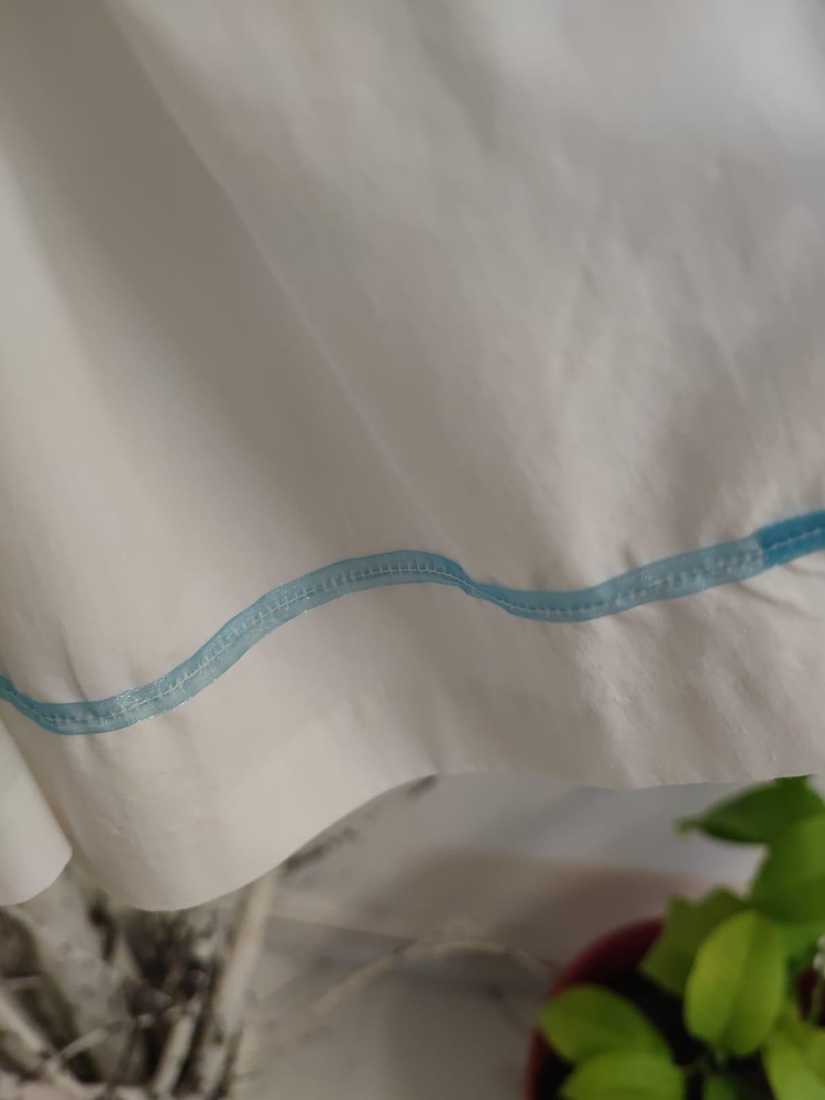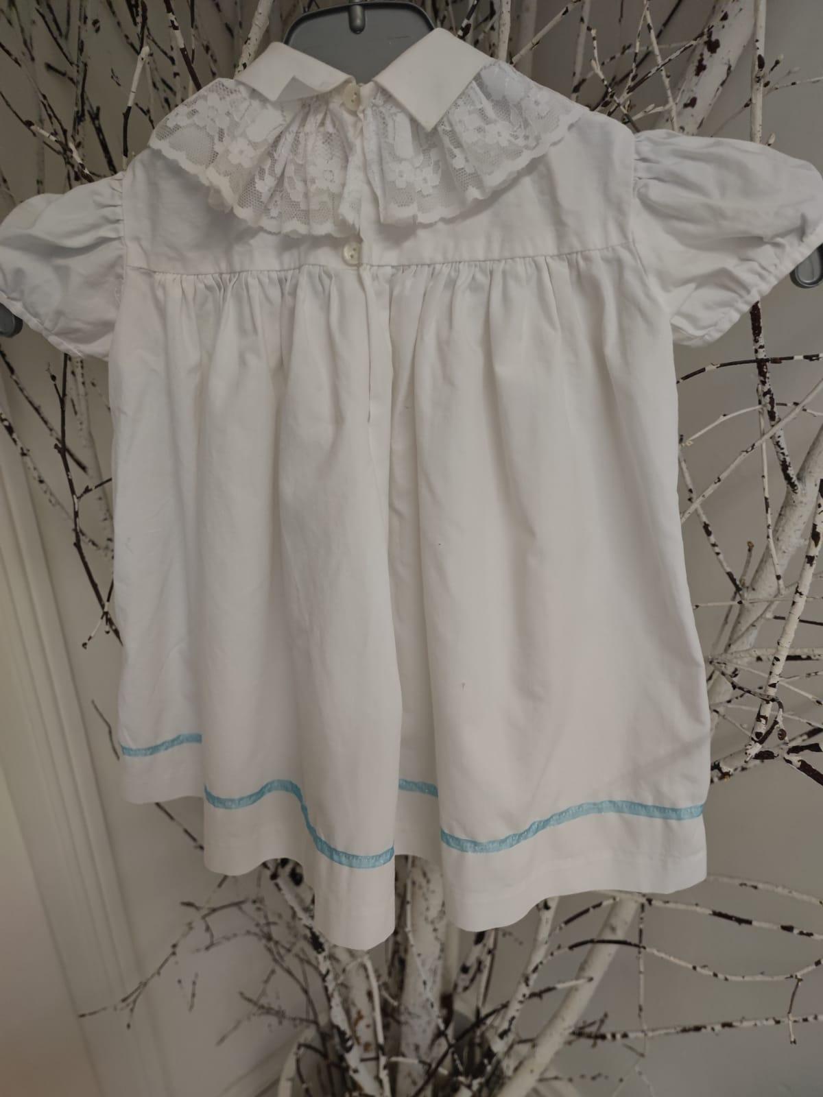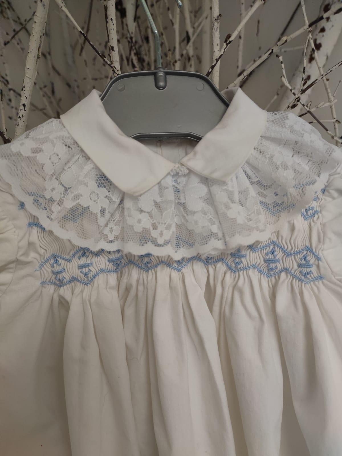Brassière double gaze blanche avec inclusions dorées, finitions biais coton fleuri, col plissé dentelle, boutonnage arrière.