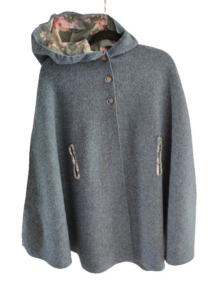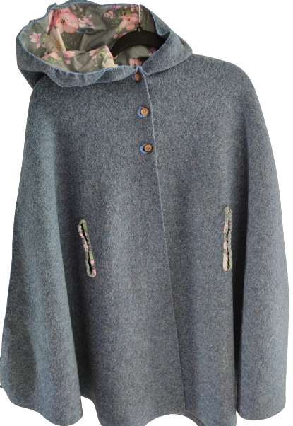 Cape laine bouillie bleu acier, capuche doublée coton fleuri, fentes main finition biais coton fleuri, découpes brodées point tunisien, boutons bois.