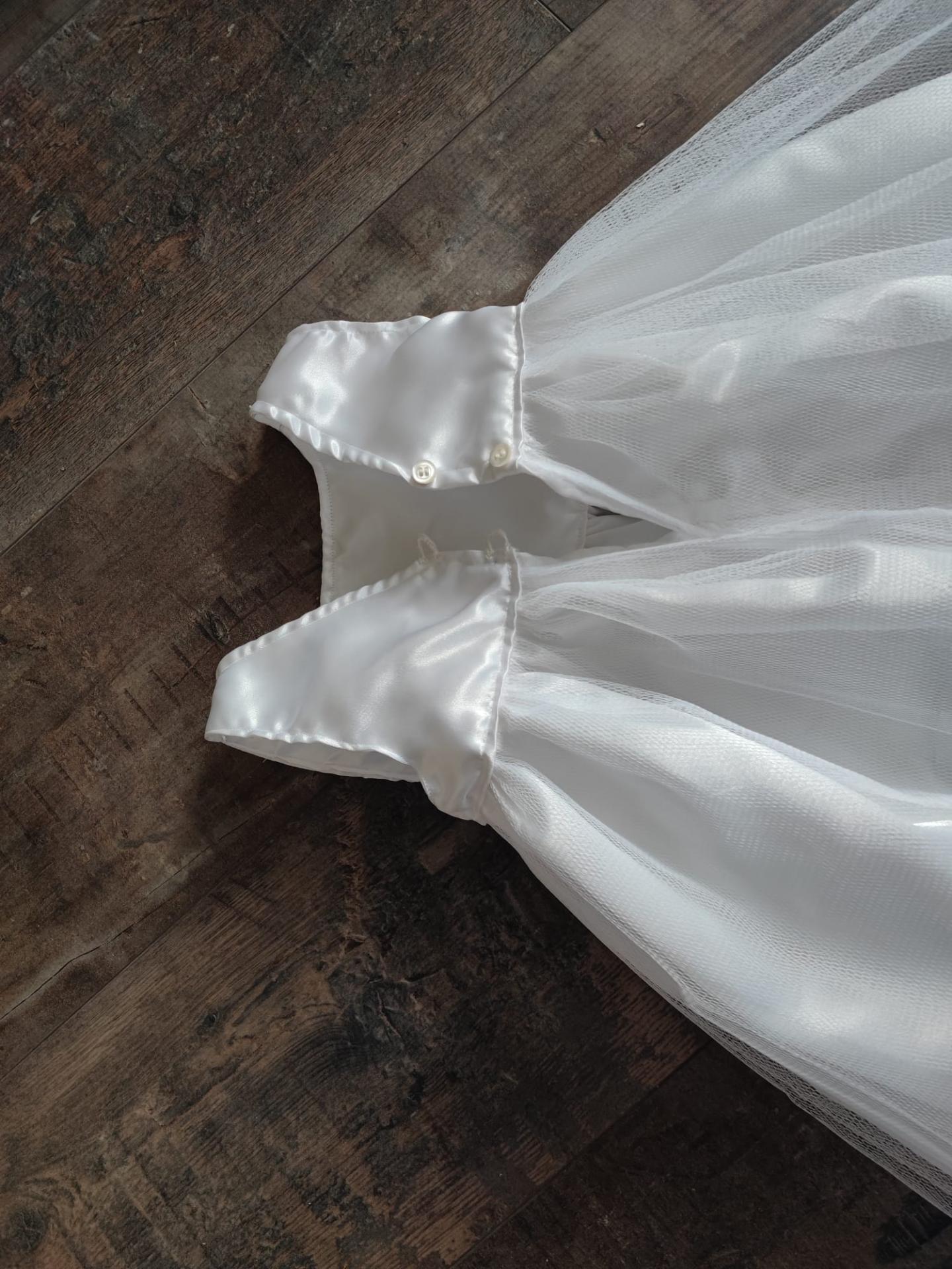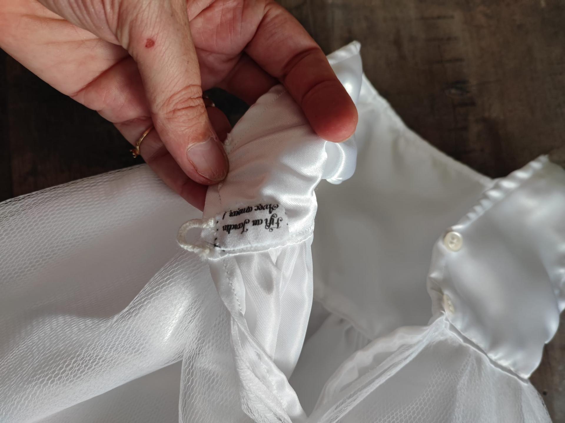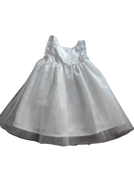Robe satin et tulle, empiècement empire, doublée, ceinture coton, boutonnage arrière, jupe à effet vaporeux.