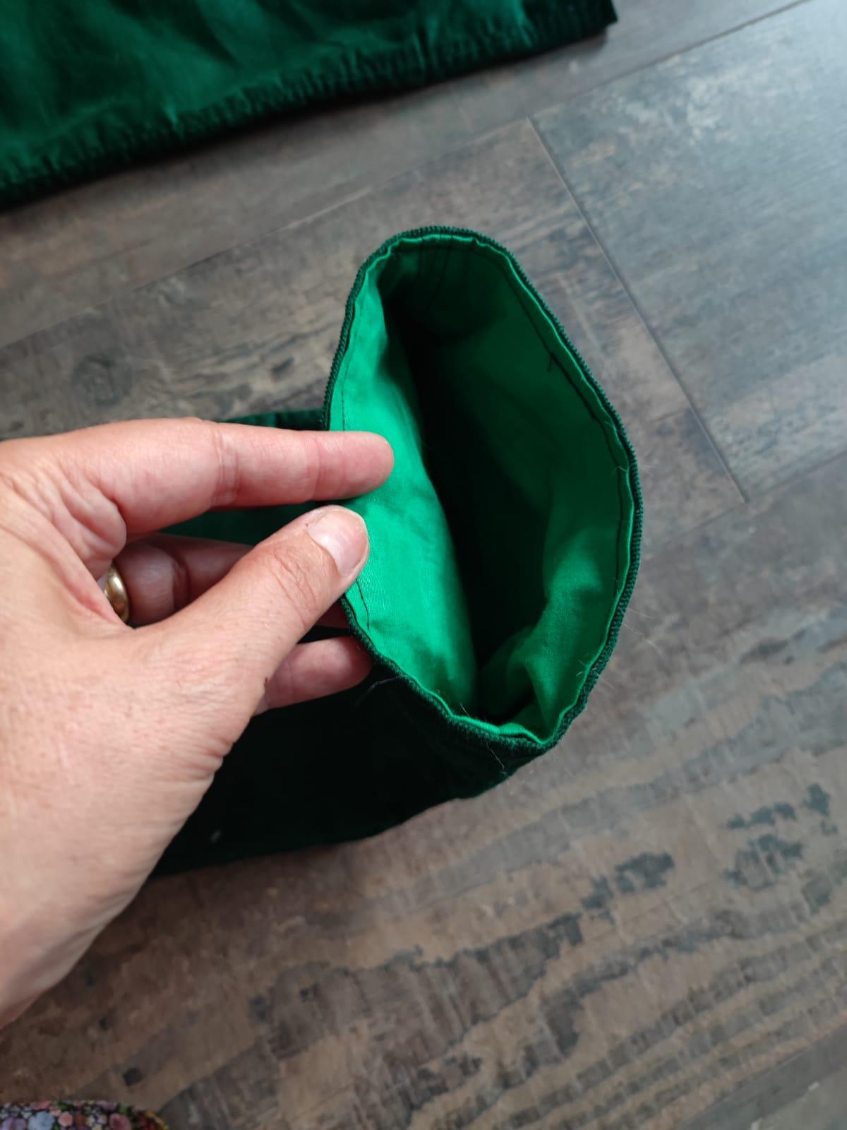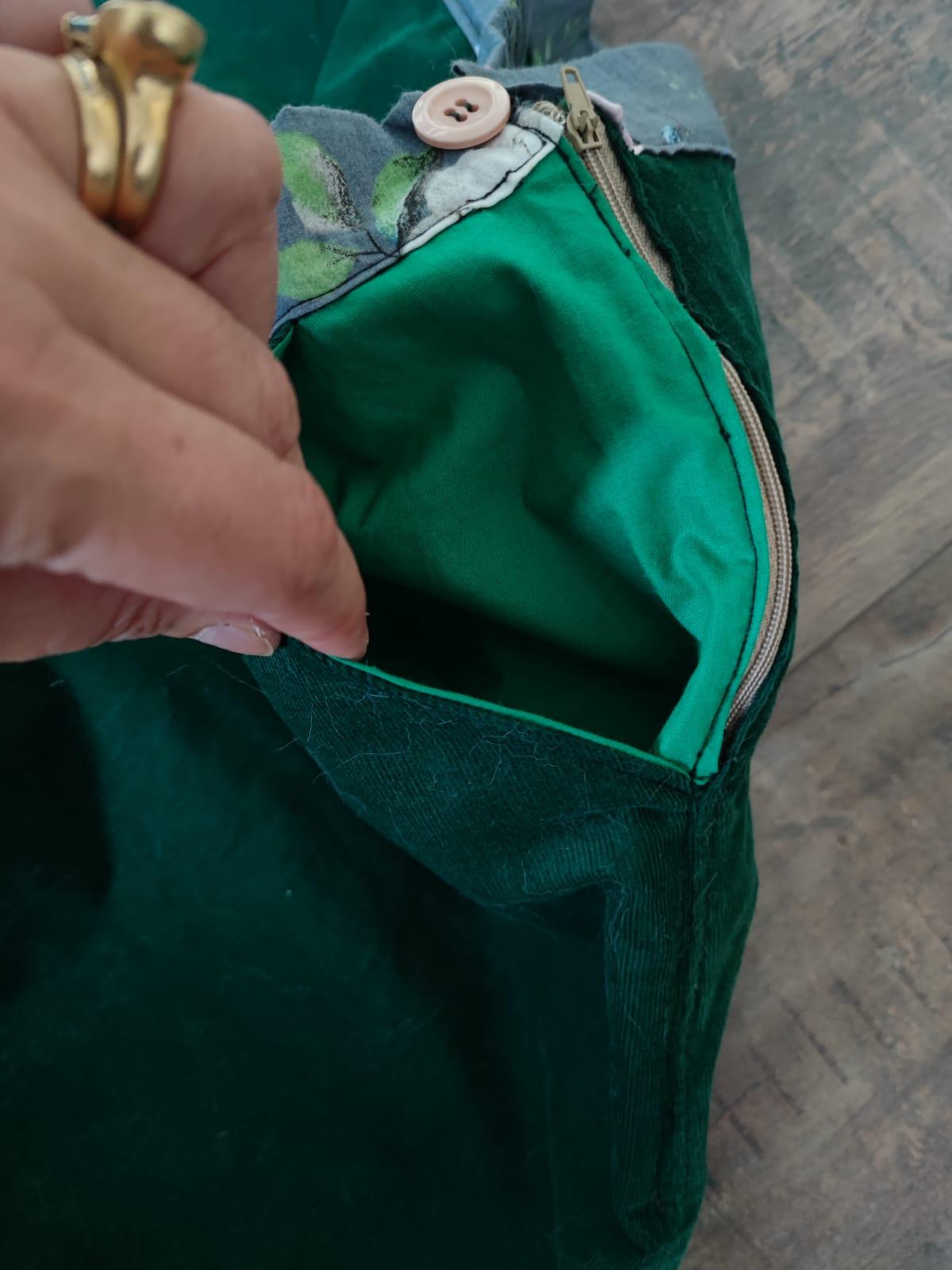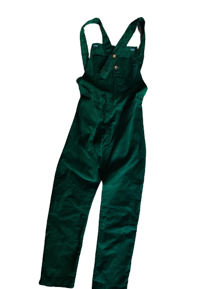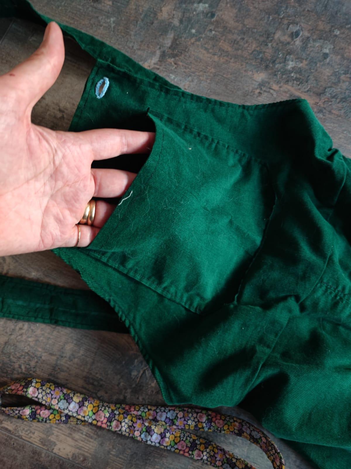 Salopette velours doublée coton vert bouteille, poche poitrine coton fleuri, bretelles avec bouton bois.