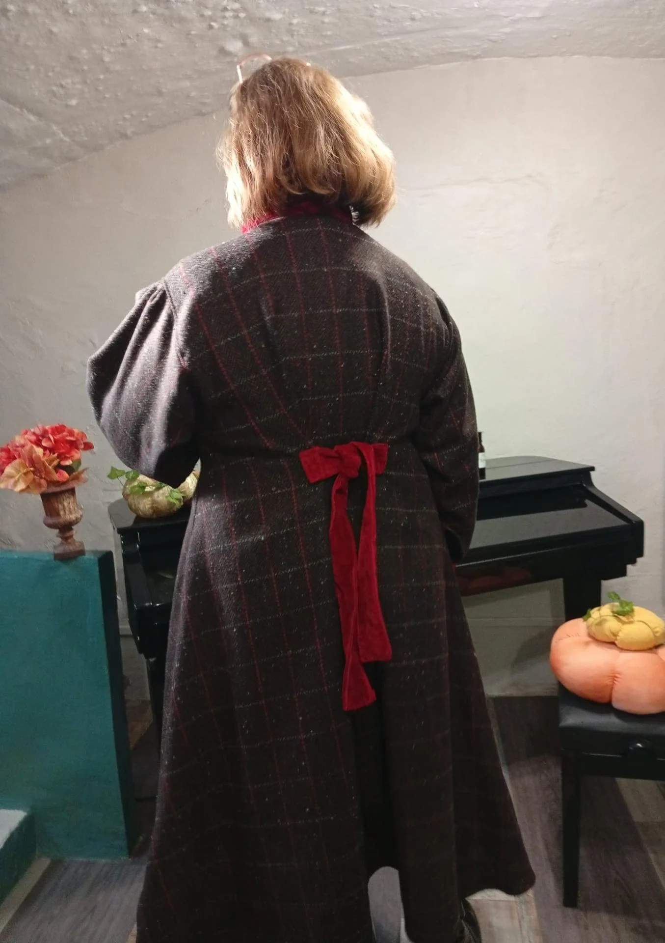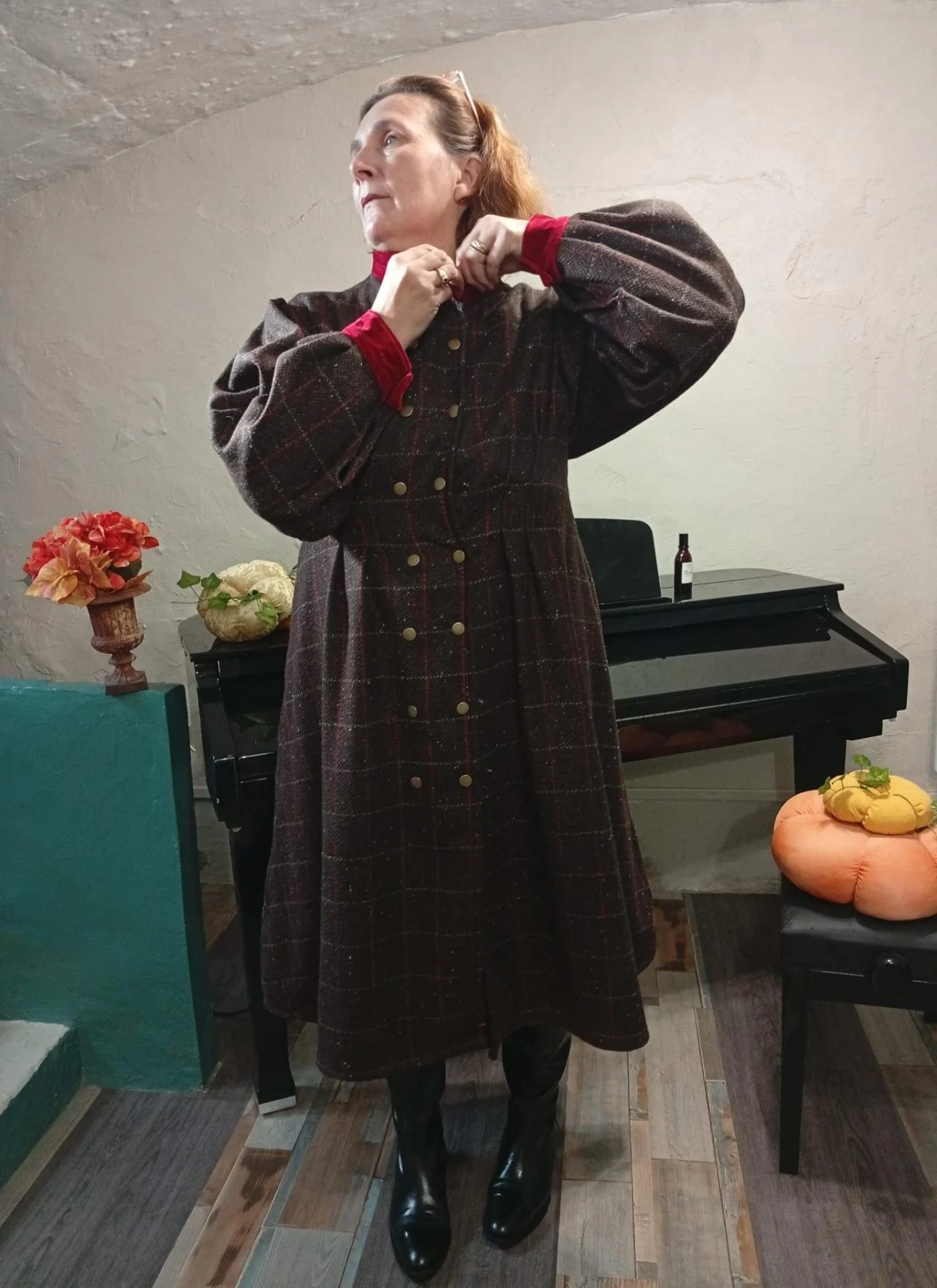 Robe-manteau élégante en tweed laine et velours, avec double boutonnage officier et martingale au dos. Confection artisanale française, chic et intemporelle.