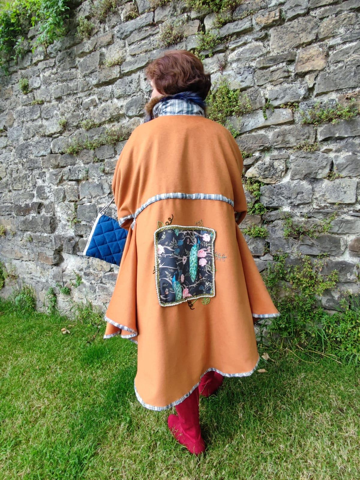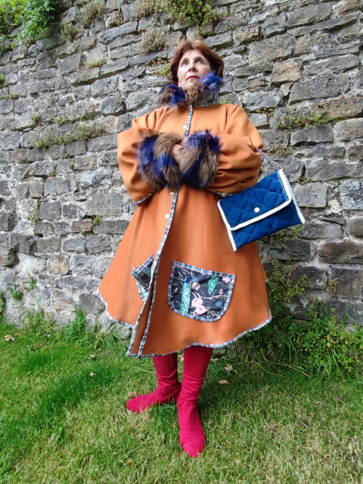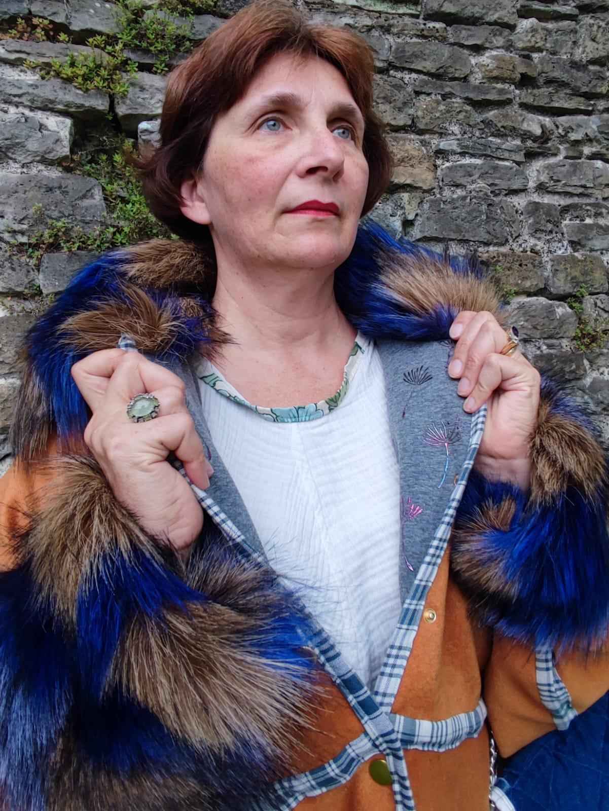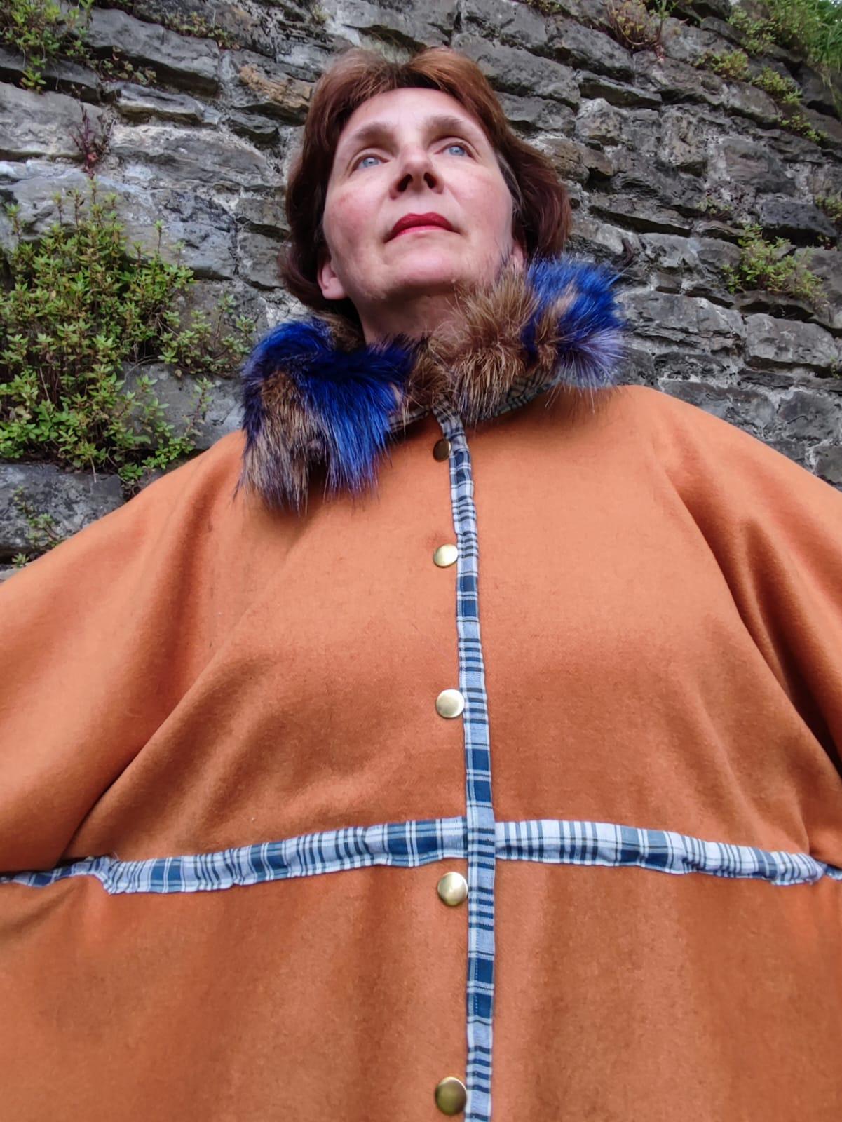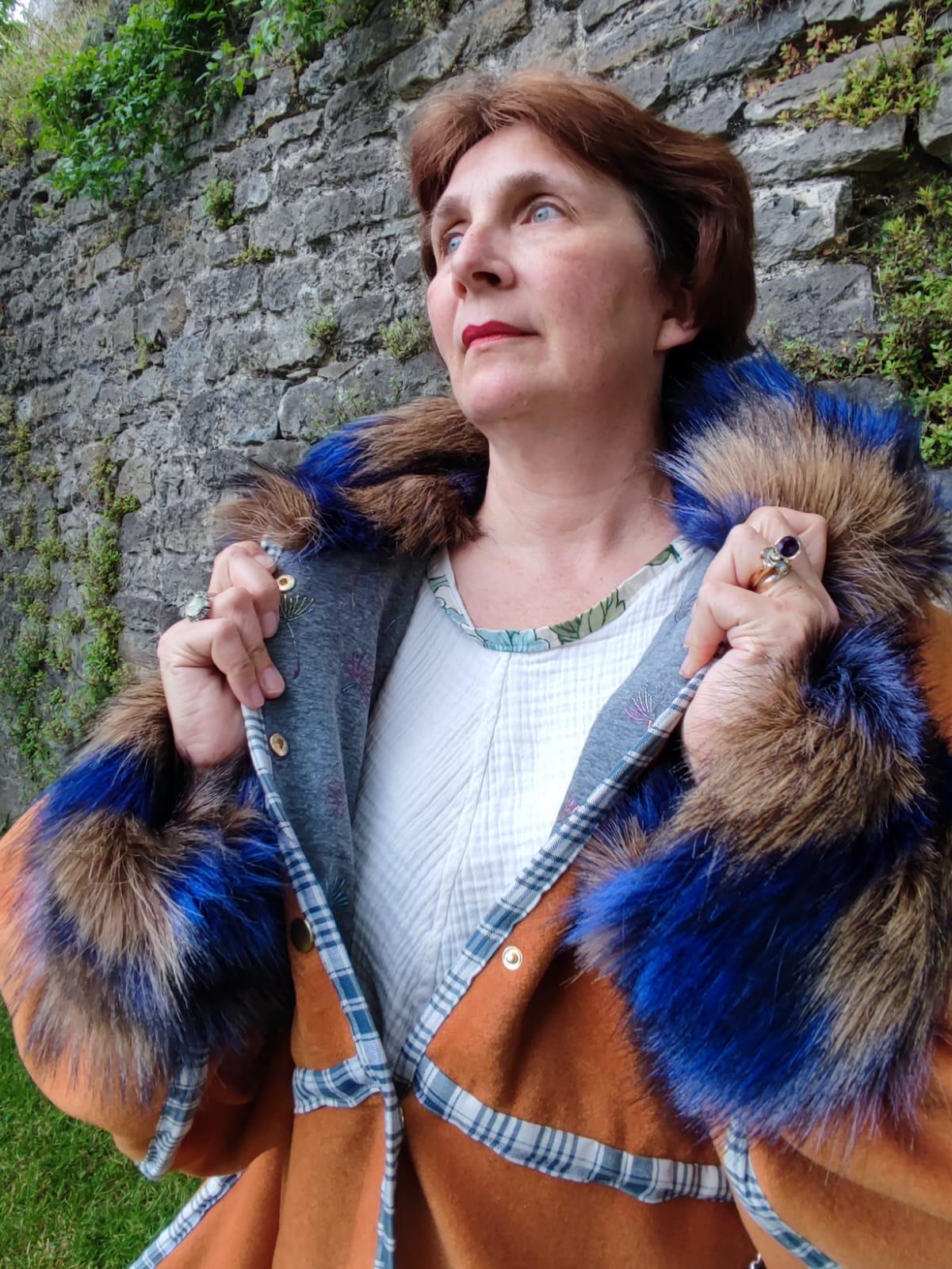 Manteau Tsarine en laine, fourrure d'imitation et velours, doublure épaules polaire, broderies dos, fermeture par pressions, biais en kelsch traditionnel.