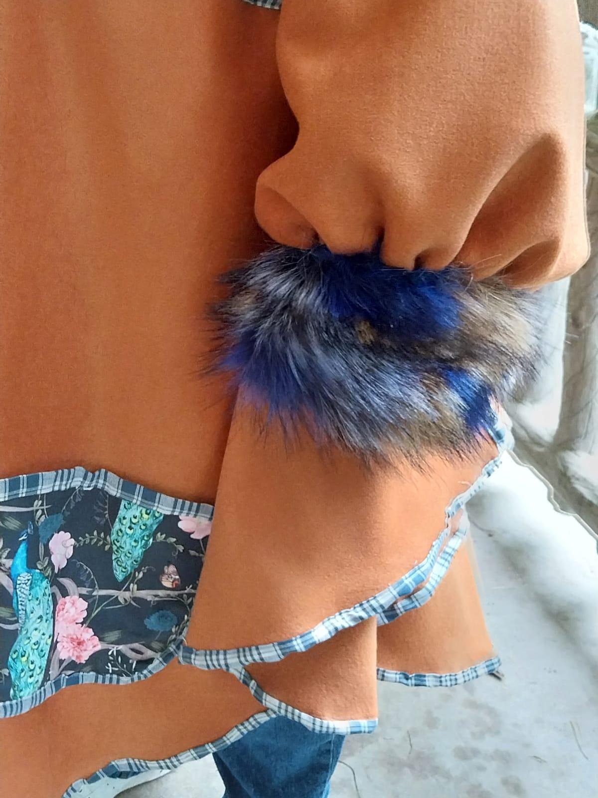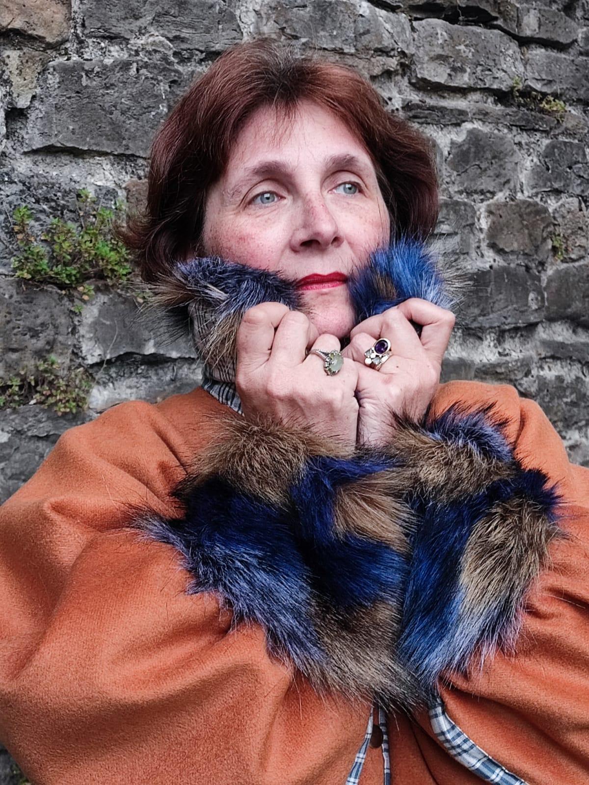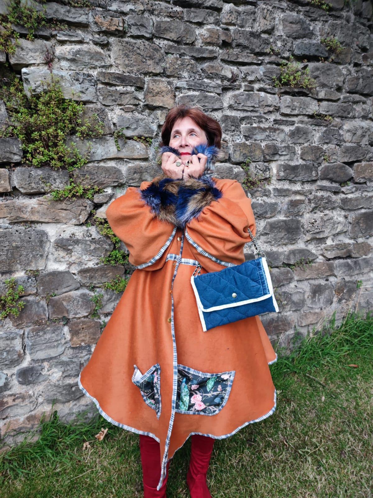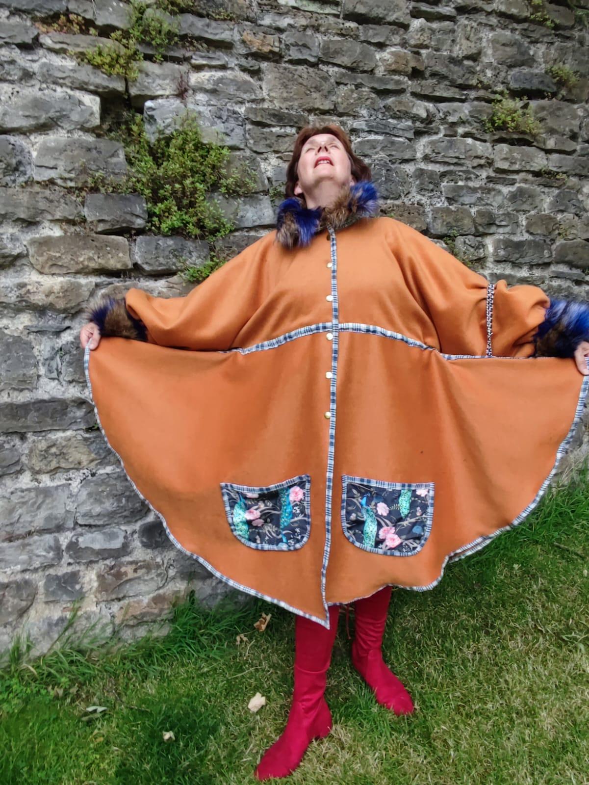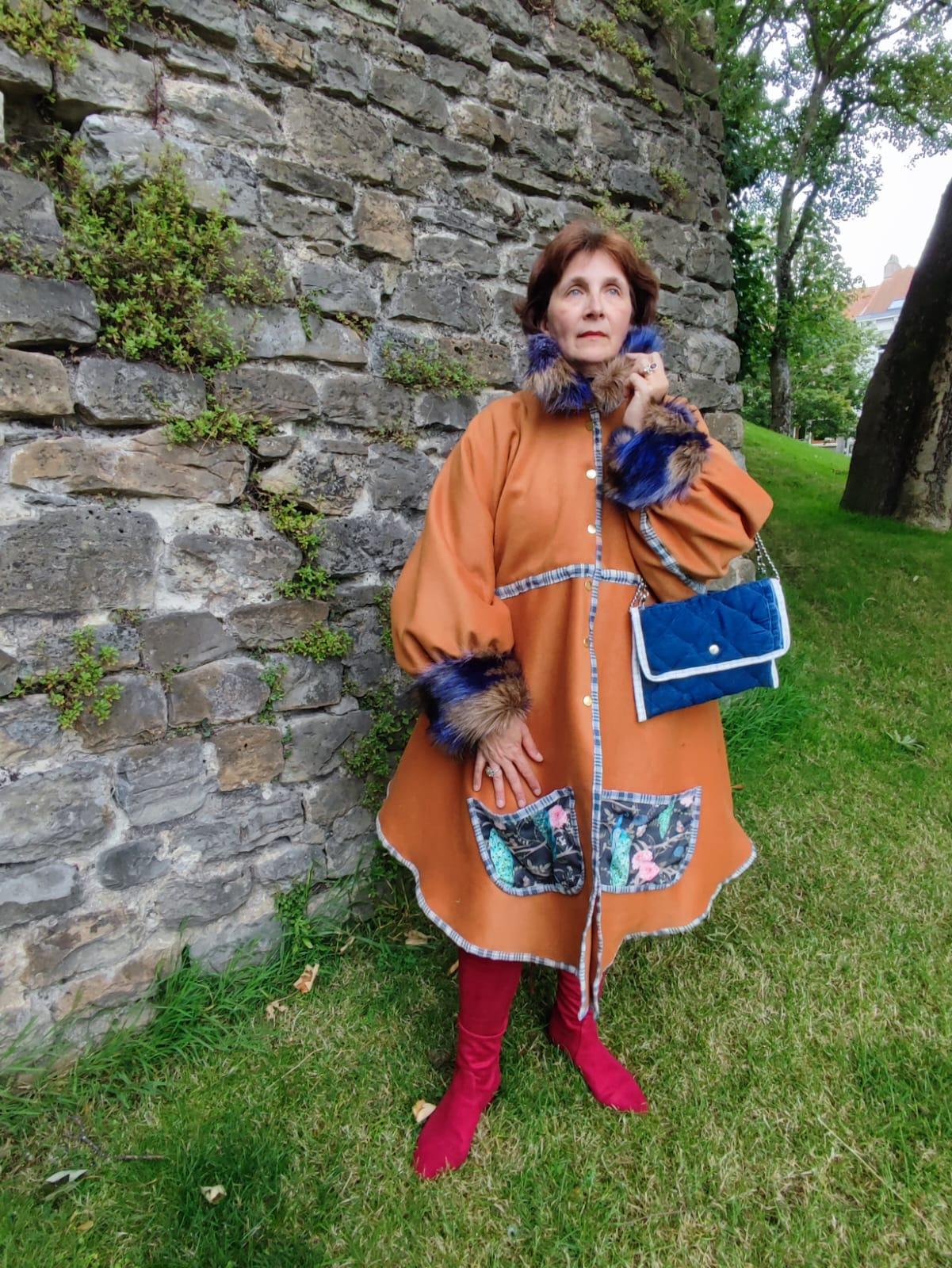 Manteau Tsarine en laine, fourrure d'imitation et velours, doublure épaules polaire, broderies dos, fermeture par pressions, biais en kelsch traditionnel.