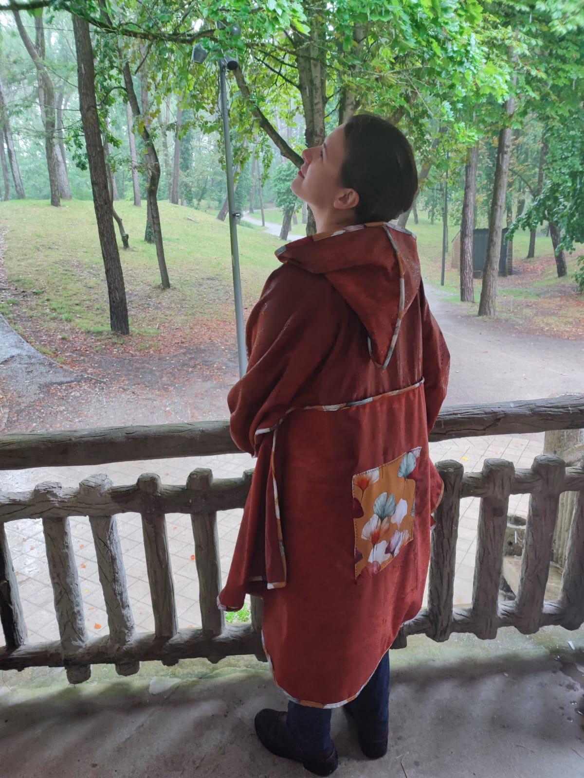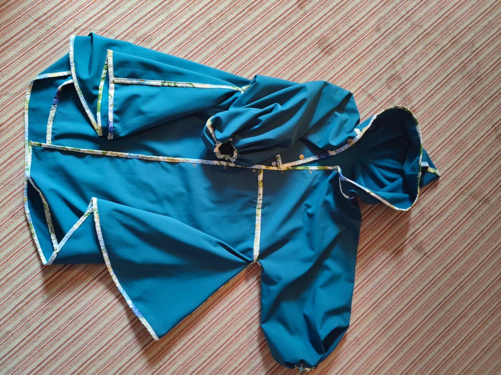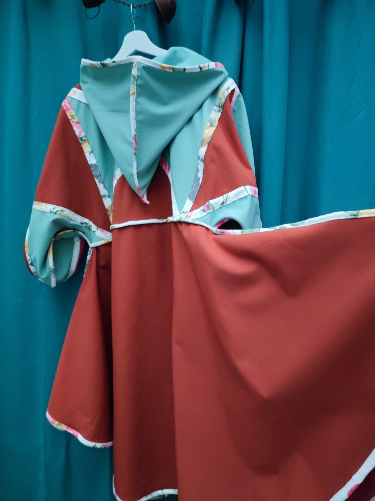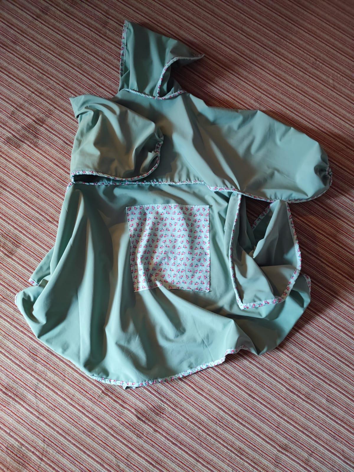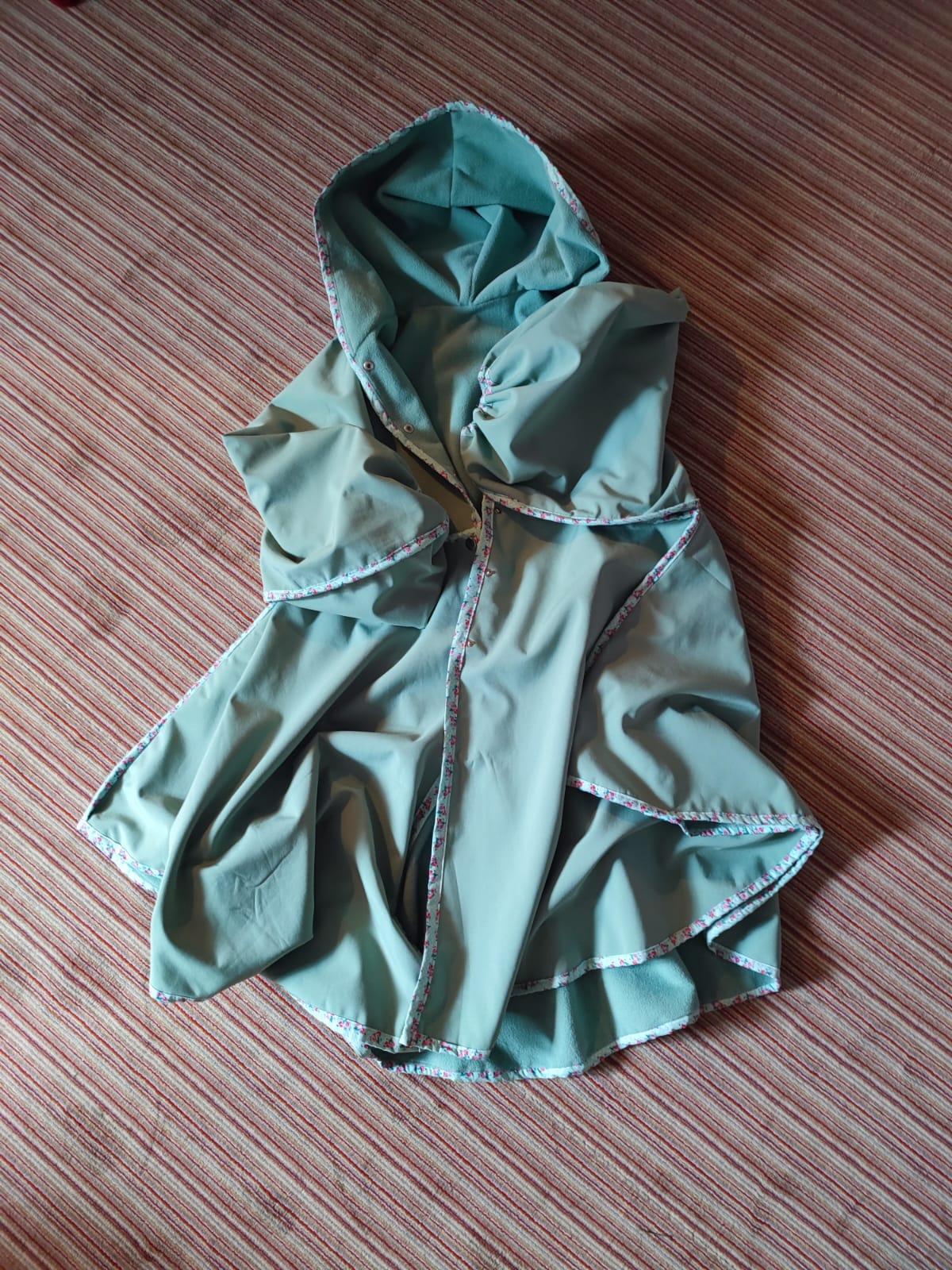 Softshell, imperméable et chaud et biais coton, fermeture par pressions, capuche, manches aux poignées élastiques, pour sortir sous la pluie, pour être au chaud ou pour se cocooner: réalisé à la main dans notre atelier de Boulogne sur Mer, 100 % coton, softshell, élastique + beaucoup d'amour !